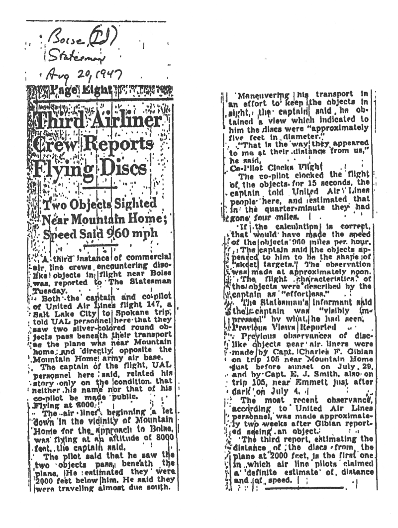 12 p.m. United Airlines Flight 147, a Salt Lake City to Spokane trip, encountered two flying discs. The pilot and copilot related their story only on the condition that neither of their names would be made public. The airliner was beginning a letdown in the vicinity of Mountain Home for the approach to Boise and flying at an altitude of 8,000'. The captain saw the two objects, which appeared to him to be the shape of "skeet targets", pass beneath the plane estimated at 2,000' below him and traveling almost due south. Maneuvering the plane to keep the objects in sight he estimated the discs were approximately five feet in diameter. The co-pilot clocked the objects for 15 seconds and calculated they had gone four miles in that time, indicating 960 mph. There is nothing in the Project Blue Book files for this case but Dan Wilson was able to find the newspaper article. Detailed reports and documents articles/470818mtnhome_article.png (Dan Wilson) |