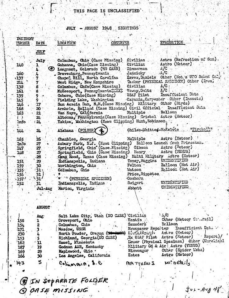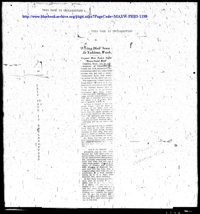 | Dan Wilson: July 25, 1948; Yakima, Washington 2 p.m. CAA observers saw a silver ball-shaped object flying west over the city against the wind. The same or similiar object was seen again around 4:30 p.m., flying lower and seemed to have flashing lights. Hundreds of calls flooded into the CAA office concerning the moon-sized flying object. A farmer, Victor Kroum saw a flying sphere at about 10 a.m. at Punkin Center, Washington and he notified the CAA tower at Yakima. This locale is just west of the Hanford Works site. |