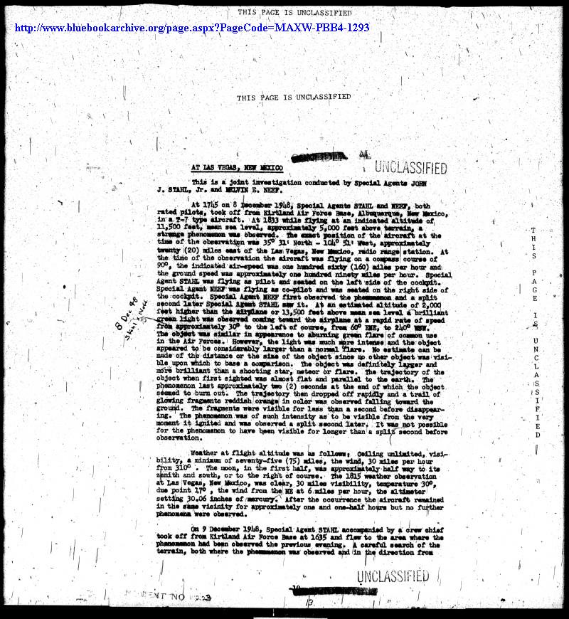 6:33 p.m. Two AFOSI Special Agents, Capts. Melvin E. Neef and John J. Stahl, Jr., returning from investigation of green fireballs in a Beech T-7, heading E at 90° and 190 mph at 11,500 ft altitude and 5,000 ft above ground, saw green fireball 30° to the left of their flight path, to the ENE at 60° azimuth, at an estimated 2,000 ft above their flight altitude of 13,500 ft., which shot past them maintaining almost level flight until the end to the WSW at 240° azimuth when it seemed to burn out and drop suddenly with reddish-range glowing fragments which lasted less than 1 sec. Later aerial search of the ground site in daylight found nothing. (FOIA) Detailed reports and documents OSI Case 11, MAXW-PBB4-1293 - BB Microfilm (Fran Ridge) OSI Cases 8,9,10,11,13 - BB Microfilm (Dan Wilson) |