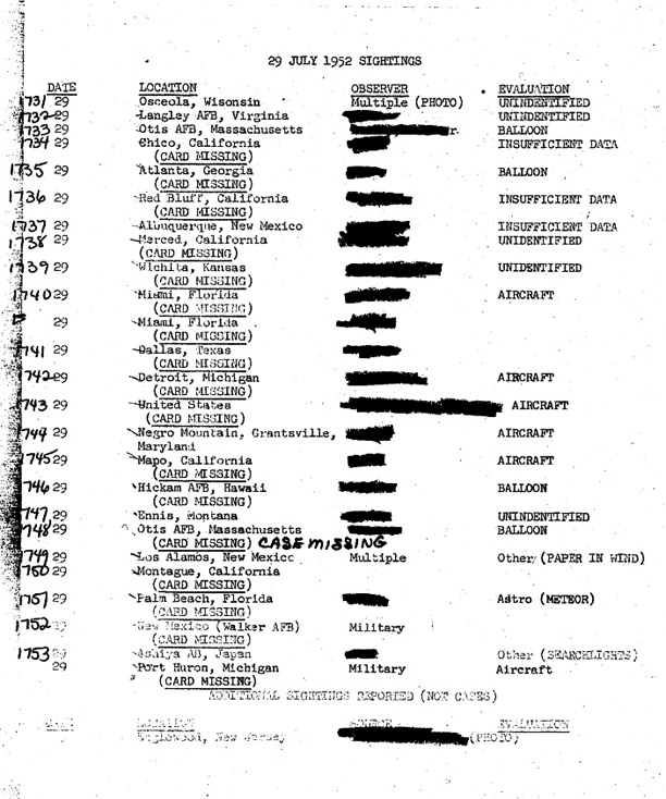 1:30 a.m. Radar operators on ground and pilot of F-5l Mustang in flight. Several clusters of up to 10 small radar targets and one large target. Small targets moved from SW to E at 50-60 knots (60-70 mph), following each other. Large target moved at 600 knots (700 mph). Pilot confirmed one target. 1 hr. Summary says photos were taken. (Berliner) Detailed reports and documents |