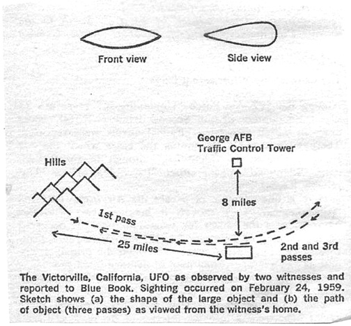 Among the 587 Air Force “Unidentifieds,” there are 33 Close Encounters of the Second Kind (CE-IIs), those cases in which associated physical effects were reported. There were also CE-IIs among the cases which the Air Force evaluated as “Identified,” though in many such cases “Identified” meant either “Psychological” or “Unreliable Report.” Here is one example of a case the Air Force declared “psychological” even though it involved two witnesses who observed the object for several minutes. It occurred on the evening of February 24, 1959, in Victorville, California. The intelligence officer described the principal witness as “an average young man of average intelligence …liked by his schoolmates and teachers.” His CE-II is summarized below: The young man’s attention was first captured by a bright light shining into the interior of his darkened bedroom. It was a bright, white steady light which was reflected against the wall opposite his bedroom window. He realized that it was much too intense to be the headlights of a car. As his parents were at night school and he was in charge of the house and his younger brother, he got out of bed, dressed, and went out on the front porch of the house to see where the light was coming from. Also, the family’s pet dogs had by this time commenced to howl and run around as if terrified, and he wanted to let them into the house. He first sighted the object in a due westerly direction, at an elevation of about twenty degrees, but at an undetermined distance. It resembled an elongated egg (see sketch), about 156 feet in length [derived from the boy’s statement that the object was slightly larger, top to bottom, than his hand spread (7.5 inches) at arm’s length (27 inches) when at a distance of about 80 feet]. The object was about twice as long as it was thick. Despite its brightness, the object had a dull red color with purple waves coursing through its extremities. It emitted a sound which was described as similar to the hum of a large transformer, but higher in pitch; or similar to, but vastly greater in volume from, a whip swishing through the air. The object came toward him, its first approach lasting about ten seconds. It flew directly toward his house, on a steadily declining altitude of approach, and passed over his front yard at an altitude of about eight to ten feet. It then veered gradually to the northeast. Oddly enough, he could hear the object only while he could see it. Even odder, the boy was puzzled at his inability to see the object from the rear, when this should have been possible. He went back into the house to calm his younger brother and the dogs. When he went outside again, after five minutes, he observed the object due west of the house and once again approaching him. It appeared that this time the object would pass closer to the house; by now truly frightened, he went back into the house to get a gun. But as the object sped past the house he lost his opportunity to use it. It was at this point that his younger brother saw the object through the front living-room window, which was covered by a split bamboo blind. About five minutes later the boy went outside again and once more observed the object to the west of his position, but this time approaching at a high speed. He re-entered the house as the object sped past. Twice more the object passed directly over the house, the last time some fifteen minutes after the first pass. By the last approach, the vibration of the object could be felt throughout the house. In addition to the disturbance of the animals, it was reported that the radio, which had had very clear reception until then, was completely blocked by intense static. The static on the radio was not evident before 10:00 P.M. nor after 10:15 P.M., which seems to indicate that some electrical or magnetic disturbance was present in the immediate area during that time. The witness further stated that each time the object passed overhead he could hear a very sharp cracking noise which he compared with the spark gap of an automobile spark plug, but of greater volume and intensity. He was emphatic that this noise was not that of a sonic boom, which he had heard many times previously. When his parents arrived home at approximately 11:00 P.M. the incident was over; but the family pets were still whimpering and shaking and hiding under the furniture. Two neighbors living in the area were questioned separately and admitted that at “about that time,” they also experienced severe radio and television interference. They would not, however, give any details nor did they give the reporting officer permission to use their names. The interrogating intelligence officer stated that the witness “was sincere, did not change his story although questioned several times on different points and seemed generally convinced that what he saw actually exists.” The parents testified to the strange behavior of the animals; and there was no evidence from either parents, neighbors, or friends that the boy was unstable. Nevertheless, Blue Book chose to label this case “psychological.” The figure on p. 168, is scanned in separately. |