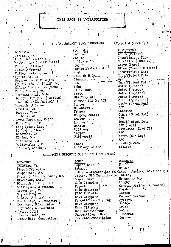 Winter, 1965; Maltin Airport (Toronto), Ontario, Canada Two persons who had just landed planes were in a parking lot cleaning snow off their windshields. A bright light just appeared between them about ten feet from the witnesses. It hovered there for a few seconds and then “drove off into the wind.” The object was a fiery white round ball about one foot in diameter. It never quaked or jiggled not made any noise. (Mike Swords) Early in January, 1965; ??? Vermont Dusk. State Pathologist Dr. Richard Woodruff and a Vermont State trooper saw three orange objects cross the sky in succession. They were also seen by four persons living in Randolph.4 Jan. 1, 1965; Norfolk, Virginia (BB) 3:13 a.m. EST. A Norfolk Police patrolman observed in the western sky one round large light leading 7-8 smaller bright lights in trail in single file formation on a straight and level flight path from south to north. The large light had the apparent size of a dime held at arm's length. A split second before the final disappearance another large object seemed to shoot out ahead of the original large object. The observer was prompted to report his sighting after the local news announced the Patuxent River Naval Air Station radar tracking of two UFOs on 29 December. Jan. 5, 1965; Lynchburg, Virginia (BB) On this date, (exact time not given) witnesses observed a round circle of light high in the sky moving southward. The object would pause then continue on course. This was reported to the Weather Bureau at the Lynchburg Airport by telephone. The area was scanned for 30 minutes by a AN/FPS-6 height finder radar. The length of the visual observation was 5 minutes. (Dan Wilson, BB files) Jan. 5, 1965; Wallops Island, VA (BB) 5:56 p.m. EST. A NASA engineer, M. Dempsey Bruton, head of the Wallops Island (Virginia) tracking station, observed a round bright yellow light rising from the horizon at 200 degrees azimuth. The apparent size of the object was that of a nickel held at arm's length. As the object reached an overhead position it disappeared. The length of observation was approximately 8-9 seconds. The witness claims that his wife and brother-in-law made the same observation. (Section IV; Section VIII). Jan. 8, 1965; Georgetown, South Carolina (BB) 9:00 p.m. EST. A civilian observed two lighted objects approaching from SE over the ocean between Georgetown and Charleston. The objects were at an estimated altitude of 2-3 miles. The objects made an "U" turn and then went back out to sea. The objects' speed was estimated as faster than jets. There was no sound. Objects apparently caused TV interference. (Dan Wilson, Project Blue Book files) Jan. 10, 1965; South Boston, Virginia (BB) 7:15 p.m. EST. The observer Strickland heard a hissing noise and looked up to see a large object with a long trail of sparks moving across the sky from north to south. After a few minutes the witness heard several planes overhead. (Dan Wilson, BB files) Jan.10, 1965; Silver Springs, Maryland (BB) Night. Three members of family observed a bright white light (1/2 size of the size of an automobile?), flying straight from NW to SE. The object was believed to be 200 feet from the ground and in level flight at 45 degrees elevation. The sky was overcast and visibility was 4 miles, according to the RECORD CARD. The length of observation was 5-10 seconds.The time given for the sighting on the RECORD CARD is 1555Z which converts to 10:55 a.m. EST. The time given on the JOINT MESSAGE FORM says 1555Z, at night. (Dan Wilson, BB files) Jan. 11, 1965; Washington, DC 4:20 p.m. At least 12 persons, including six Army Signal Corps communications system specialists observed 12-15 white ovals maneuvering erratically across the sky, with jets seen in pursuit apparently from Andrews AFB. Among the witnesses were Messrs. Paul M. Dickey, Jr. and Edward Shad. The Defense Department denied the incident. The witnesses have publicly maintained their story. (Section II). Jan. 12, 1965: Blaine AFB, Wash. (BBU) 1:00 a.m. Member of a federal agency, who was driving
