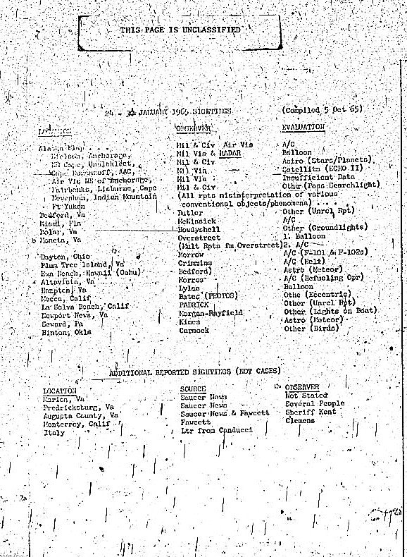 Jan. 24-28, 1965; Alaska (BBU) Unknown location in Alaska. (McDonald List) Jan. 24, 1965; Eielson, Alaska 10:00-11:00 p.m. local – green/white light in sky. (Dean) Jan 24, 1965; Unalakleet, Alaska White light with flashing yellow and green. Hovering in north at 30-50 miles distance. (Dean) Jan. 24, 1965; Richmond, Virginia A radio newsman and his wife saw an orange ball of light streak across the sky and "blink out" over Richmond.5 Jan. 24, 1965; Salem, Virginia Five college students reported that an oval object kept pace with their car on a darkened highway near Salem. The object, at an altitude of about 400 feet, was observed to have three yellow lights and one green. Jan. 24, 1965; Verona, Virginia A couple reported seeing a bright yellow light that hovered overhead for about five minutes before heading for Staunton. Jan 25, 1965; Alaska. NE Cape 1357-1407Z. Orange light in sky at 330 deg azimuth, 20 miles away. Jan 25, 1965; Cape Lisburne, Alaska 1300Z. Orange light in sky WNW, elevation 22-26 degrees, tracking north. Jan 25, 1965; Anchorage, Alaska Slow moving blue/red/green light in the NE, moving south. Jan 25, 1965; Alaska Alaskan Airlines Flight 1049. Captain Gyle, co-pilot and flight engineer, flying between McGraff and Anchorage, 26/0500Z saw, in front of the plane, an object on a south to north course, for 35-60 seconds. Not a satellite. Jan 25, 1965; Cape Romanzoff, Alaska Red/green flashing light at 190-degree azimuth, 45-degree elevation. Jan 25, 1965, Marion, Virginia A policeman and several other witnesses observed an object which took off from a wooded area on a hill. Traces were allegedly found. Jan. 25, 1965, Fredericksburg, Virginia The same night, approximately twenty minutes after observation No. 20, nine persons saw a top-shaped object emitting sparks which moved up the Rappahannock Valley at a low altitude. Jan. 25th, 3 mi N. of Bedford, Virginia (BB) 10:55 a.m. A person saw an aluminum-colored object of large dimensions fly slowly westward. Five minutes later, two persons at Moneta (10 miles southwest of Bedford) saw a bright cigar flying south to north. Jan. 25, Washington, D.C. 12:45 p.m. five Stoddert School students in Glover Park, near Washington D.C. saw an object resembling 'an airplane without wings'. First described as silver in color, it became luminous and changed from orange to red, then green. Jan. 26, 1965; Brands Flat, Virginia Nightfall. Seven young people were driving (see observation No. 14) when they allegedly spotted a strange looking individual of small height. They pursued him, and two others that appeared, to a wooded area where all sight of beings was lost. Police investigators explored the area but could find no trace of the supposed 'creatures'. Later one of the witnesses and a photographer resumed the search and said they found an aluminum-colored object, when the photographer received a mysterious blow on the head. The two men fled the scene after an attempt to photograph the object. This photo was reportedly "confiscated" by Government agents who are also said to have "silenced" the witness. Jan. 26, 1965; Marion, Virginia Evening. The Marion police received numerous telephone calls concerning a stationary object described by Rev. Preston H. Robinson as circular and showing several lights. It flew away at high speed. Jan. 27-28, 1965; Altavista, Virginia (BB) 1:35 a.m. EST. As reported in accordance with AFR 200-2, one witness observed a bright light the size of a golf ball to baseball held at arm's length. The object was observed maneuvering in an erratic pattern in and around three aircraft (2 aircraft the first night and 1 aircraft the second night) up and down over and above. (Dan Wilson, BB files) Jan. 27, 1965; Plum Tree Island (Hampton), Virginia (BB) 6:00 p.m. EST. A NASA research engineer, A. G. Crimmins (located at Hampton) observed an object that was approximately 75 feet across and 10 to 15 feet in height. The object had 3 to 7 lights colored red and orange. The object appeared to rotate. The object first appeared at an azimuth of 20 degrees and a maximum of 75 feet of elevation. The object moved approximately 1/4 mile west of the original position on a zigzag course and then appeared to land on the shore. It remained fixed for approximately five minutes. The object then took off to the north and then turned right to depart to the east at a high rate of speed. The object was viewed through 20-power binoculars. There were apparently other reports of similar sightings in the same area at approximately the same time. (UFOE II, Section IV). Jan. 28, 1965; Fort Yukon, Alaska (BBU) 3:30 a.m. local time. An object was tracked on radar at the same time and direction as visual sightings of tear drop shaped objects. Object tracked on FPS-6 and FPS-20A radars. (Dan Wilson) Jan. 28, 1965; Alaska From 1230Z to 1605Z, Alaskan NORAD region, 709 ACW Squadron [66:40N; 145:10W] reported observing two objects in the sky. Lt. James A Buckingham observed one object at 350 degrees azimuth, 40 degrees elevation, while the other was at 320 degrees azimuth, 40 degrees elevation. They appeared silverish, changing to reddish orange. Through binoculars they were flashing reddish orange. The sky was clear with 15 miles visibility. These visual objects appeared to be slowly descending. Last seen on the horizon. Jan. 28, 1965; Alaska Between 1236 and 1316Z radar sets FPS-6 and FPS-20 (operator Ssgt John E Finney) picked up one object which Lt Buckingham said was on the same bearing and at the same elevation as one of the visual objects. The radar object was lost at 350 degrees’ azimuth, distance 84 miles, height 26,500 feet, speed 20-24 knots, when the blip faded. Radar scope photos were taken. The investigating officer believed the radar object was a balloon, although there were no known balloons in the area. Jan. 30, 1965; Newport News, Virginia (BB) 8:35 p.m. EST. Five high school students observed a triangular shaped object, size compared to si
