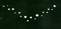 Let us consider the series of Hart photos, one image of which is shown in Figure 1. (Standard high-quality scans of the Lubbock Lights photos can be downloaded from a number of reputable Web sites. I have used high-resolution scans that take well to "zooming in" without the image breakup characteristic of lesser-quality scans.) After Air Force investigators interviewed the young photographer in Lubbock beginning in September 1951, the photo images were examined by analysts at the Air Technical Intelligence Center (ATIC) at Wright-Patterson Air Force Base in Ohio. ATIC's own findings are useful here. (For an account of the center's work, see Brad Steiger, ed., Project Blue Book: The Top Secret UFO Findings Revealed, Ballantine Books, 1976, pp. 99-100.) It determined that the image size (of the whole wing formation of 18 objects) was 0.12 inches across on the negative, and that from the camera's focal length of 2 inches, the ratio 0.12" / 2" yielded an angular size of 0.06 radians (roughly 3.4°) for the whole group of 18 objects in the sky (in comparison, the moon subtends 0.5°). ATIC further concluded, in effect, that for every mile (5,280 feet) that the lights were distant from the camera, the size of the wing would have been 0.06 x 5,280 = 316.8 feet. (ATIC actually said 310 ± 30 feet.) This only establishes a relation between size and distance from the camera. For example, if the objects had been two miles from the camera, the wing would have been twice as far across, or about 630 feet. But we can do better than that, with some added information.