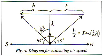 The significant thing about this underbelly structure, for at least one of the objects seen and photographed over Lubbock, Texas, in August 1951, is that a Roswell crash debris witness has described the same structure on the underside of what may well be the crashed Roswell object of 1947. When I interviewed George Newling on May 12, 2001 (following up on an interview by Don Schmitt) and handed him a printout of the beehive LL12 image, without telling him how or where I had gotten it, he said, "This is what I saw in the bomb bay." He was a ground maintenance crew member in Roswell in 1947 and had glimpsed a large, metallic-gray object propped up or wedged in the bomb bay of a B-29; afterwards he was immediately escorted away from the plane by MPs with machine guns. From Newling's testimony, it would appear that the Lubbock objects and the Roswell UFO were quite similar. Newling describes the peculiar object in Roswell as being tightly fitted into the B-29 bomb bay, and as that bomb bay is known to have been 9.5 feet across at its widest point, it follows that the object (assuming that what Newling saw was the whole object) was about 9.5 feet across. As a working hypothesis, I will assume for the moment, then, that each of the Lubbock Lights, if essentially the same kind of object, was about 9.5 feet across. In an enlargement of the wing formation in Figure 2, one may note that the LL12 image is 1 /18 of the angular size of the whole formation, though not because there are 18 objects (this is a coincidence, as the objects have space between them and are not linearly arranged), for an LL12 angular size of (1/18) x 0.06 = 1/300 of a radian. Also, the distance across the wing would then be 18x9.5 =171 feet. Recall that ATIC' s analysis noted that the lights would span about 317 feet if one mile from the camera. If the lights actually spanned less than that distance, then they must have been closer to form the same image size on the negative. Since one may multiply angular size by distance d to obtain an approximation of the object's actual size, and since the size of LL12 would hypothetically seem to be about 9.5 feet, we have (1/300) x d = 9.5, or distance from camera is approximately d = 300 x 9.5 = 2,850 feet. Then by doing a little further computation under the current assumptions, we may approximate the air speed. I've provided a diagram in Figure 4 to illustrate the calculations. If we let h denote half the distance flown in three seconds in the Texas Tech professors' sighting, and let A be the angle subtended from first sighting to loss from view (i.e., A = 90°), we have h/d=lan(A/2) = tan(45°) = 1, so that h = d = 2,850, and the whole distance flown in 3 seconds is about 2 x 2,850 = 5.700 feet, for an air speed of 5,700/3 = 1,900 feet per second or (1,900 ft/sec x 3,600 sec/hr) / 5,280 ft/mile, or approximately 1,300 miles per hour. This is nearly twice the top speed for conventional aircraft of that time.