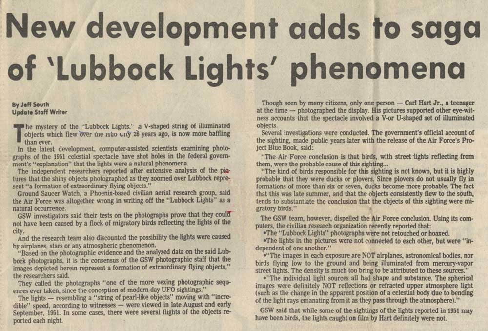 Dr. J.C. Cross, head of Tech’s Department of Biology, examined the 35 mm photographs, and asserted, "It definitely wasn’t caused by birds." In Matador, reports were made of a "noiseless aircraft flying at a low altitude, without aid of propellers or wings." They said it was different from any aircraft they had ever seen.