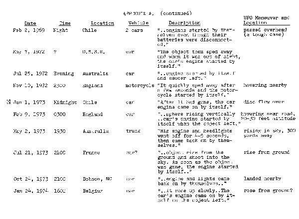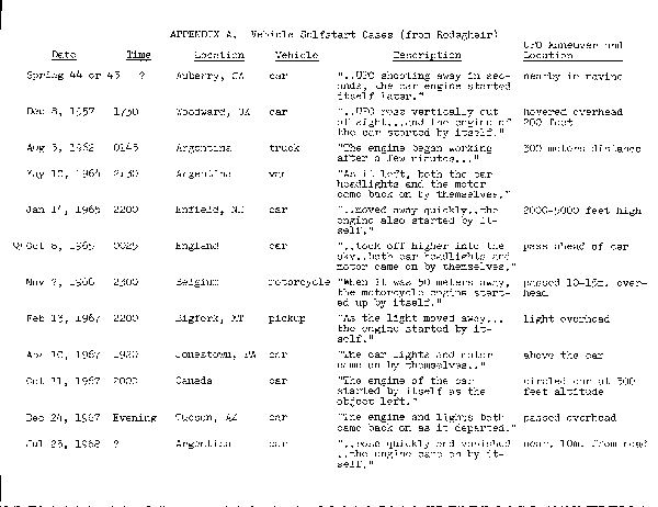 by clicking the active link preceding each abbreviated page) APPENDIX A. Vehicle Selfstart Cases (from Rodeghier) Click here for 83-54.gif 83-55.gif 83-56.gif __________ APPENDIX B. HISTORICAL MUSING The only reported self-start prior to 1957 occurred in the spring of 1944 or 1945 in Auberry, California. As this predated the wave of 1947 by 2 or 3 years the case may be suspect, but it is provisionally accepted at face value. (Reference 11) As there were a great many UFO sightings in the decade from 1947 to 1957, one wonders about the paucity of self-start reports in that period. Whether witnesses were reluctant to report them or UFOs were keeping greater distances from automobiles will never be known, but the timing is curious. It is possible that the onset of self-start reports began in 1957 because of design changes about that time in the electrical system of automobiles. In 1953 the luxury cars (Buick, Cadillac, Chrysler, and Oldsmobile) converted from 6-volt to 12-volt electrical systems. Other manufacturers followed suit and by 1957 all new American cars (except Willys) had adopted the 12-volt system. (Reference 12) European manufacturers made a similar transition with a delay of about 5 years. Of course, in 1957 the majority of cars on the road still were 6-volt. In the new designs, the 6-volt coil was retained, but a resistor was added