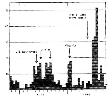 | Virginia 1965 Flap By Donald B. Hanlon The following article from the Flying Saucer Reader (FSR66vNo02_65) was scanned and transcribed by Fran Ridge and Rich Vitello from a pdf file of the original article provided below. Donald B. Hanlon: In January 1965 the eastern States of the U.S.A. experienced a UFO wave, the significance of which has seemingly been eclipsed by the remarkable renewal of activity that took place only a few months later. The very peculiar character of the January observations appears clearly on Figure 1, where it will be seen that the number of unexplained reports has been plotted against time over a two-year period. ![]() Fig. 1 Frequency of observations