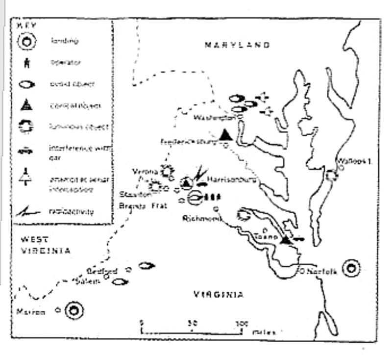 Details for this graph have been compiled from world-wide reports after stringent examinations The January observations have already been the object of fragmentary . Studies. Some of the most interesting reports, however, have come to light only recently, A new examination of the events of that period is therefore in order. In this investigation, Virginia emerges as the area of highest concentration (figure 2). We must also turn to the State of Virginia for the most significant observations. Significant Observations I have compiled a list of reports which appear to be directly related to the phenomenon under study. 1. About November 20, 1964, Kenneth Norton saw a beehive-shape object at Staunton, Virginia. 2. On November 26, 1964, Mrs. F. Rosenberg saw a bright ball of light close to the ground near Grand Valley, Pennsylvania. Increase in radioactivity was allegedly noted. An independent witness reports seeing the tight, preceded by a dark object. 3. On December 14, 1964, a spinning silvery disc was seen maneuvering over Needham, Massachusetts, for five minutes. 4. On December 19, 1964, at 3:30 a.m. the Patuxent Naval Air Station in Maryland spotted three objects in rapid succession. 5. On December 21, 1964, at 5:00 p.m.. Mr. Burns saw a huge beehive-shaped object come very close to the ground without apparent reason, in the vicinity of Harrisburg, Virginia. Radioactivity was noted by Prof. Gehman of Eastern Menonite College. 6. Early in January, 1965, at dusk,. State Pathologist Dr. Richard Woodruff and a Vermont State trooper saw three objects cross the sky in succession. They were also seen by four persons living in Randolph. 7. On January 5, 1965, at 6,00 p.m., M. Dempsey Bruton, head of the Wallops Island (Virginia) tracking station, saw a bright, orange glowing object coming from the southwest. Several other witnesses. 8. On January 11, 1965, at 4.20 p.m., at least twelve persons, including six engineers of the Army Signal Corps, saw a dozen ova! objects cross the sky, apparently followed by jets from Andrews Air Force Base. Among the witnesses were Messrs. Paul M. Dickey, Jr., and Edward Shad, The Defense Department denied the incident. The witnesses have publicly maintained their story. 9. On January 12, a! 6.30 p.m., a bright yellow object was seen for two minutes by Mr. & Mrs. Milliner, NASA public relations employees, on Wallops Island, Virginia. 10. On January 14, 1965, at 4:45 p.m., an object was seen over Staunton, Virginia, by Carl Billings and Jody Smith. 11. The same day, a stationary light was seen over Dooms at 6.00 p.m. by seven students and a bus driver. 12. The same day, Mr. James Myers, Virginia, saw a circular object rise from the ground at 12.00 p.m. 13. On January 15, at10,00 p.m., Mr. Charles Knee, Jr. of Concord lost control of his car between Enfield and Wilmot (New Hampshire) as the engine Page 14 stalled and light went off. Coming out of his car after it had stopped, the witness heard a high pitch sound and saw a bright light cross the sky. 14. On January 19, 1965 at 6:15 P. M. an industrial worker observed two circular flying objects hovering at low altitude over an archery range at Brands Flat, Virginia. The smaller objects (diameter 20 feet) landed 15 to 18 yards from the witness. Three beings about 3 feet tall emerged, uttered unintelligible noises, and returned to the object, which then took off. 15. On January 20, 1965 at 9:40 AM a slow flying object was seen over Long Beach, Mississippi. Two figures, one of which seem to be operating a "camera like device", were allegedly visible from the ground. 16. On January 23, 1965 at 8:43 PM two businessmen driving on Highway US 60 in opposite directions were stopped in the vicinity of Toano as their cars approached a huge cone shaped object which was hovering over a nearby field. Two Army helicopters were allegedly dispatched from Fort Lee to investigate. 17. On January 24, 1965 a radio news man and his wife saw an orange ball of light streak across the sky and "blink out" over Richmond. 18. On January 24, 1965 five college students reported that an oval object kept pace with their car on a darkened highway near Salem Virginia. The object, at an altitude of about 400 feet, was observed to have three yellow lights in one green. 19. Again on January 24, a couple in Verona, Virginia, reported seeing a bright yellow light that hovered overhead for about five minutes before heading for Staunton. 20. On January 25, 1965 a Marion, Virginia policeman and several other witnesses observed an object which took off from a wooded area on a hill. Traces were allegedly found. 21. The same night, approximately 20 minutes after observation No. 20, nine persons saw a top shaped object emitting sparks which moved up the Rappahannock Valley at a low altitude. This observation was witnessed from Fredericksburg, Virginia. 22. Also on the 25th, at 10:55 AM, a person situated 3 miles north of Bedford, Virginia saw an aluminum colored object of large dimensions fly slowly westward. Five minutes later, two persons at Moneta (10 miles southwest of Bedford) saw a bright cigar flying south to north. 23. Also on January 25, at 12:45 PM five Stoddart School students in the Glover Park near Washington D. C. saw an object resembling "an airplane without wings". First described as silver in color, it became luminous and changed from orange to red, then green. ![]() Figure 2 (Based on author's sketch) 24. On January 26, 1965 at nightfall, seven young people were driving near Brands Flat, Virginia (see observation number 14) when they allegedly spotted a strange looking individual of small height. They pursued him, and two others that appeared, to a wooded area where all sight of beings was lost. Police investigators explored the area but could find no trace of the supposed "creatures". Later one of the witnesses and a photographer resumed the search and said they found an aluminum colored object, when the photographer received a mysterious blow